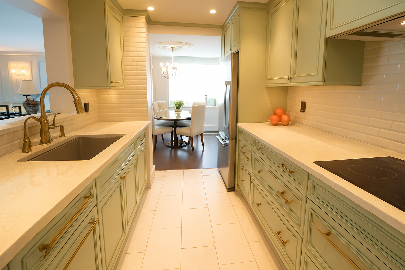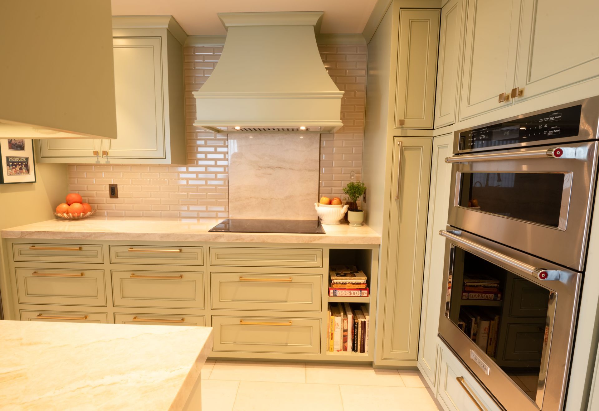 Blend Interior Design Studio’s kitchen remodel for the University Heights project introduced an additional wall of appliances along with floor-to-ceiling cabinetry for both aesthetics and function. The cabinets are finished in Benjamin Moore’s Saybrook Sage, paired with Crystalize natural quartz countertops. Warm gold accents complete the space, enhancing the bright, airy atmosphere and creating a harmonious blend of color and texture.