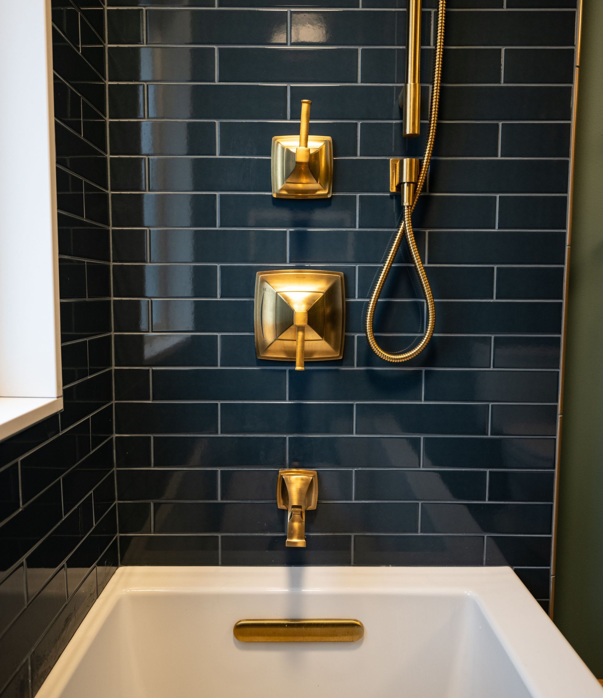 The University Heights project was designed with comfort and accessibility at its core. Off the master bedroom, the clients envisioned a serene soaking tub for unwinding. We chose a soft, textured light green tile for the tub surround, accented with an elegant gold liner. At the vanity, clay-colored subway tiles pair beautifully with creamy quartz countertops and distinguished Brizo antique gold fixtures, creating a warm, inviting retreat.