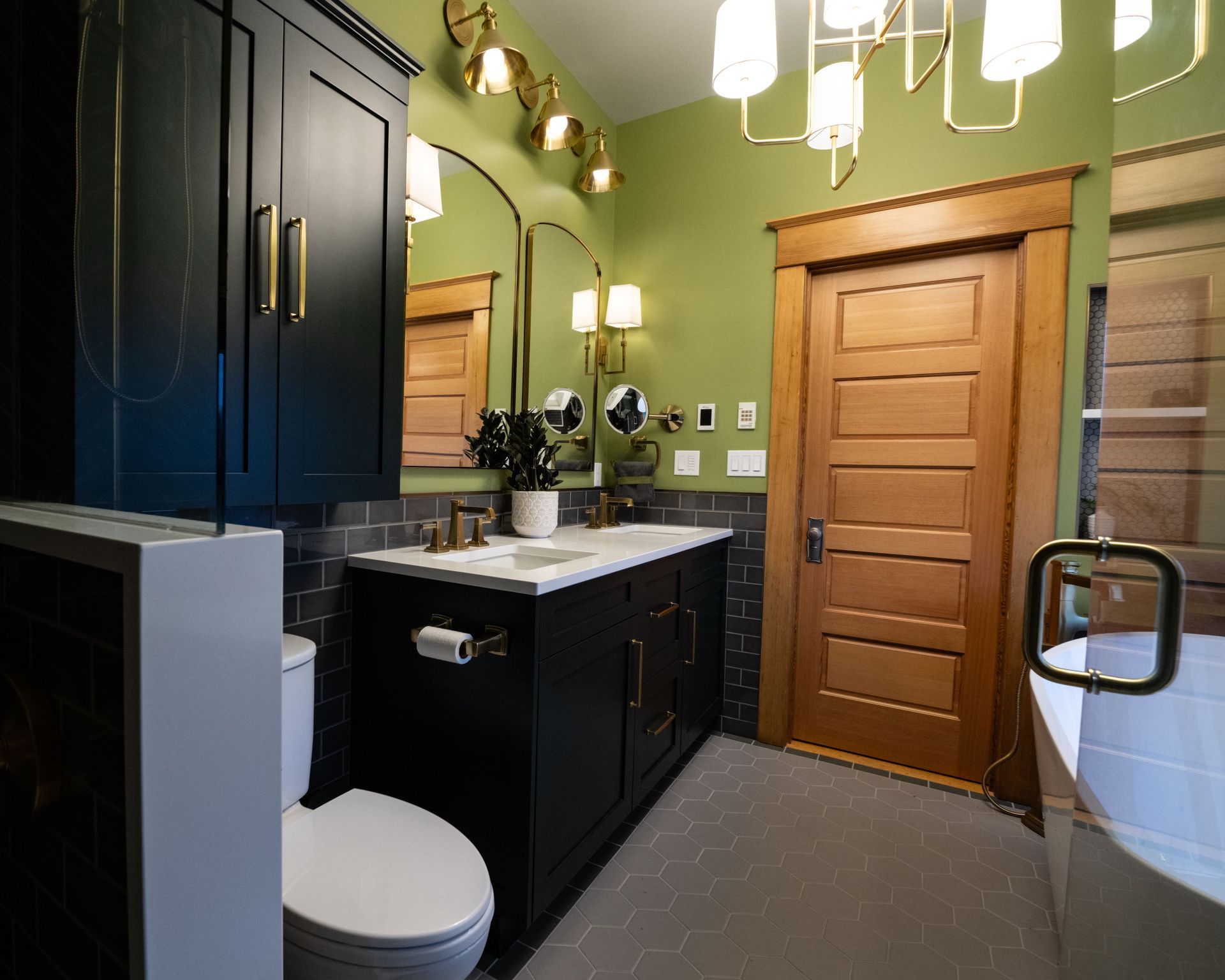 This Arts and Crafts residence had good architectural features, yet its bathrooms cried out for a rejuvenation. With non-functional plumbing fixtures, limited storage, and outdated finishes, the space begged for a transformation. Enter a meticulously crafted design plan that draws inspiration from the modern decorative movement of the early 20th century. Blend Interior Design Studio led the charge, opting for a palette of bold colors and sturdy fixtures reminiscent of the era's craftsmanship. Neutral subway tiles intertwined with warm green tones, paying homage to the Arts and Crafts aesthetic. Premium materials took center stage, including crafted tiles, quartz countertops, and shaker cabinetry. The selected vintage gold hardware and Kohler plumbing fixtures added a touch of solidarity and warmth to the design. Completing the ensemble is a freestanding soaking tub that beckoned relaxation. The result? A harmonious combination of hues and textures that seamlessly realized the client's dream of an oasis spa- like bathroom.