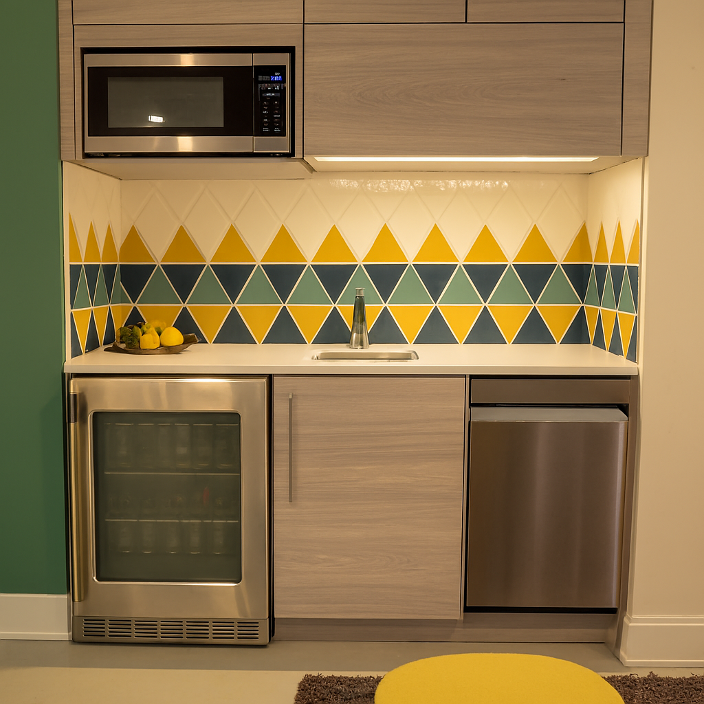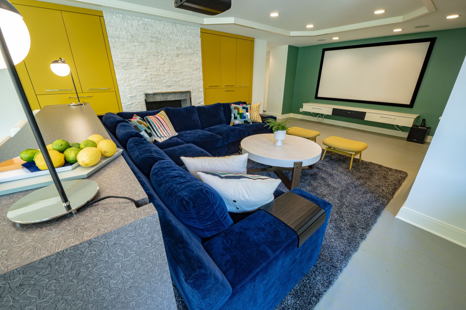 Transforming a Mercer Island home, our clients' love for color and mid-century modern architecture inspired a captivating basement remodel. Facing the challenge of a long, narrow space, Blend Interior Design Studio curated a floorplan focused on maximizing seating for family gatherings and entertainment. Central to the design is a luxurious, sprawling sectional that serves as the room's focal point, offering ample seating while anchoring the space. To optimize functionality, a custom bar table was integrated behind the sectional, providing additional seating with clear views of the projector screen. In a bright, inviting corner, a table is added for game nights or relaxed dining experiences. The design journey was heightened by vibrant finishes, including colorful geometric tiles, sleek European cabinetry, and bold wallpapers, all meticulously selected to infuse the space with personality and flair. At Blend Interior Design Studio, we thrive on crafting spaces that reflect our clients' passions and lifestyles, transforming visions into realities that exceed expectations.