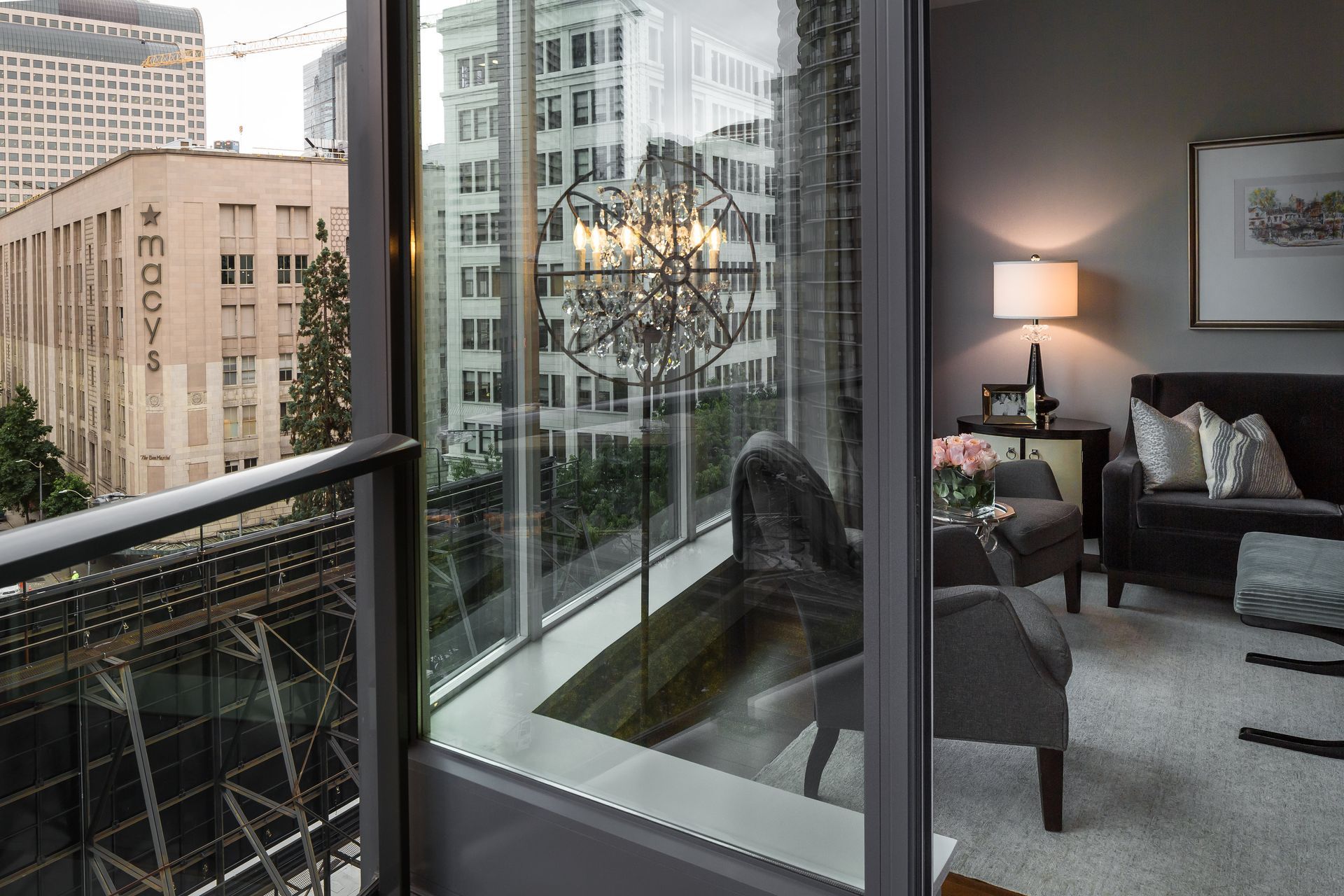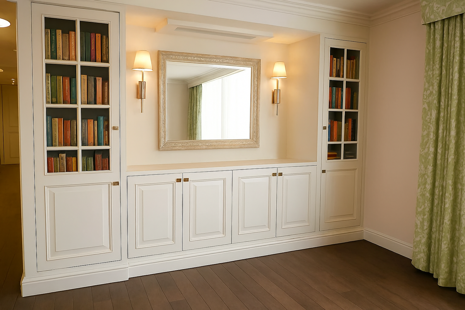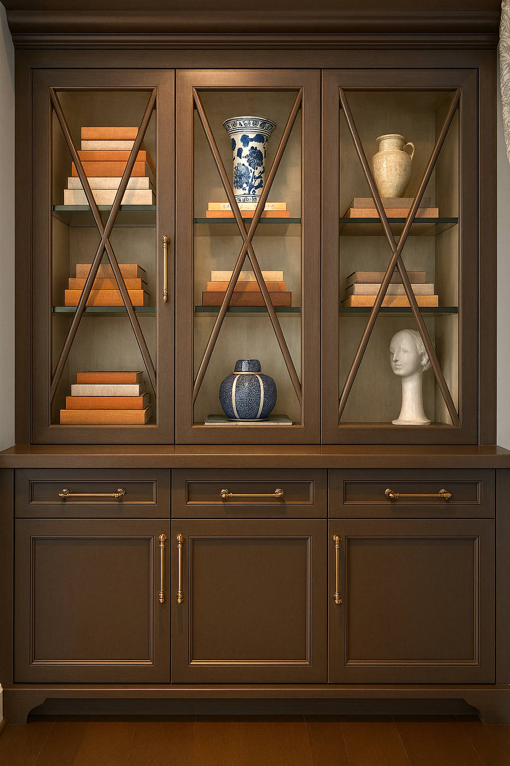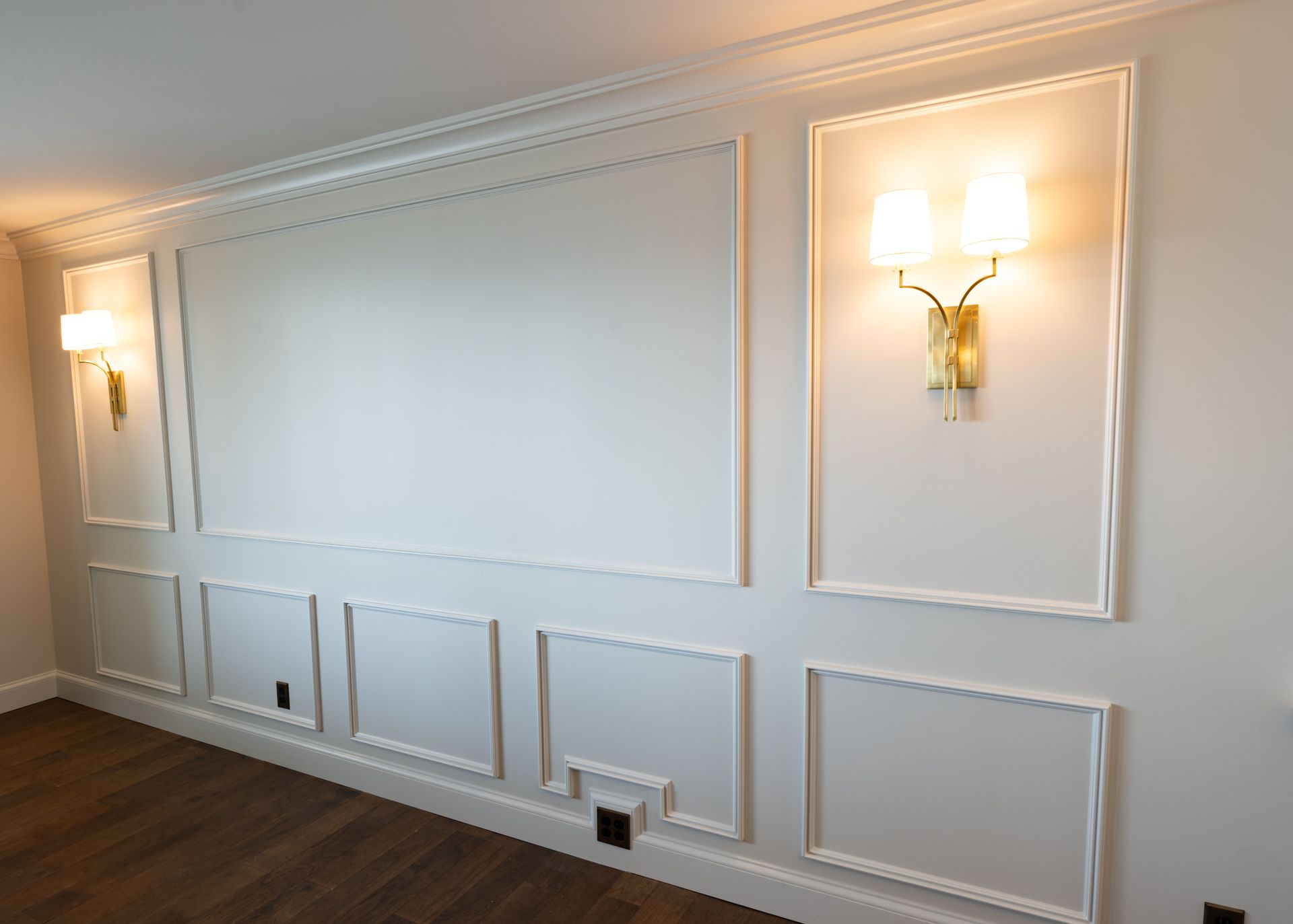In the living room, a custom built-in houses a concealed pop-up TV along with generous display cabinetry, blending function and elegance. Throughout the residence, the use of tailored millwork, including custom trim, doors, and cabinetry, contributes to a refined, high-end high-rise aesthetic.