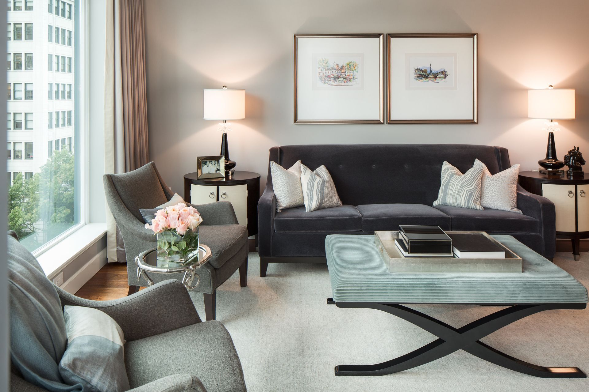 In the heart of downtown Seattle's Escala residence, Blend Interior Design Studio embarked on a mission to breathe new life into a high-rise condominium. With its excellent structural foundation, the space served as a perfect canvas for the client's vision of an Art Deco haven. Crafting a sophisticated color palette inspired by the Art Deco era, we blended taupe grays, charcoal, ebony, and crème tones, with accents in iconic Tiffany Blue. This harmonious blend of hues set the stage for a luxurious interior where sleek surfaces like smooth wood and glossy marbles worked seamlessly with sumptuous velvet textures. Central to the transformation, Blend Interior Design Studio crafted custom mahogany built-in cabinetry to elegantly house the TV and a bar cabinet for entertainment purposes, providing both functionality and cohesion to the space. Silver inlay and crystal knobs adorned the cabinetry's exterior, adding subtle yet striking accents. The entryway wall was adorned with exquisite taupe marble, complemented by a silver leaf chandelier, evoking a sense of sophistication and romance from the moment one steps foot into the residence. Clean Art Deco lines and timeless furnishings completed the transformation, resulting in a space that exudes elegance and refinement at every turn.