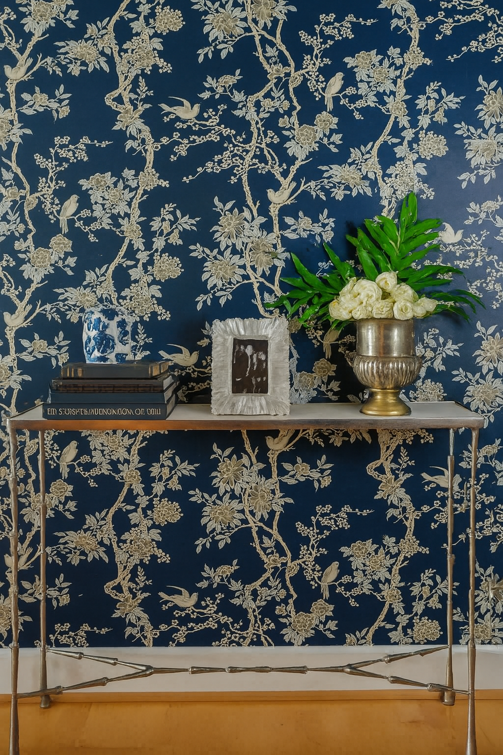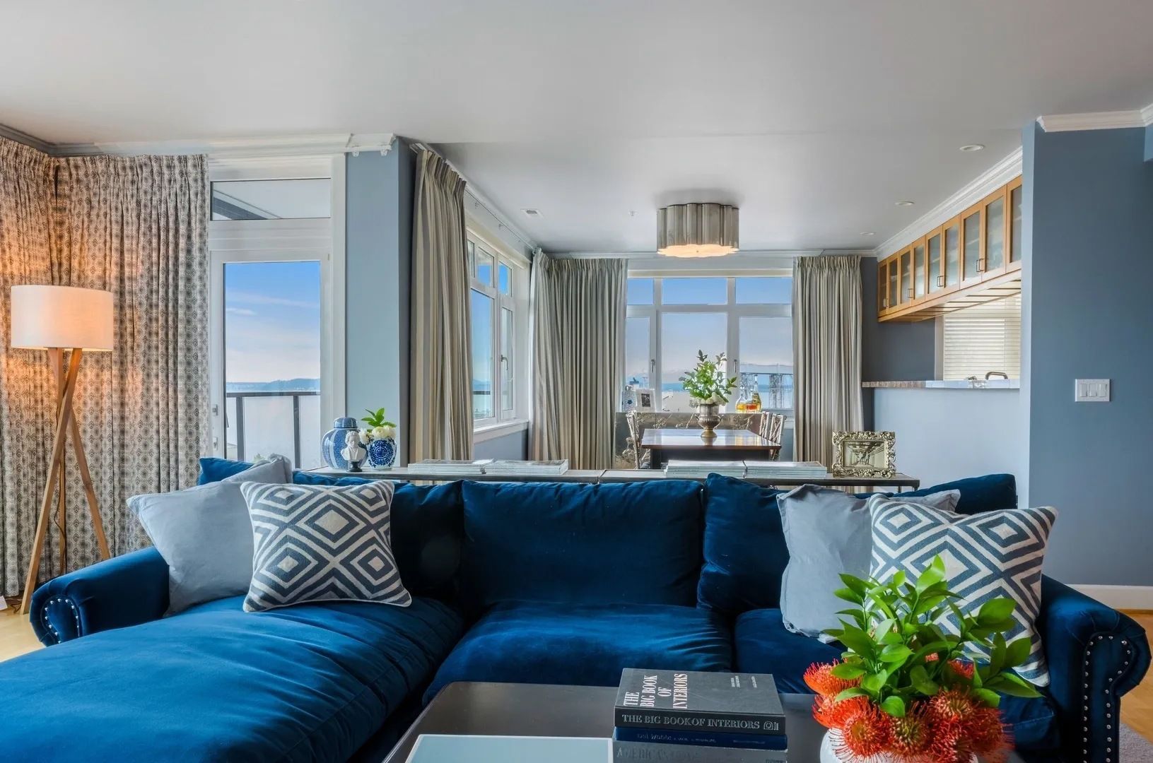 Blend Interior Design Studio undertook the transformation of this Queen Anne home, originally for a newlywed couple but now envisioned as a functional yet attractive space suitable for a growing family. The primary focus for the clients was the integration of built-in cabinetry to anchor the entertainment wall, providing storage for games, books, and miscellaneous items while enhancing the room's aesthetic appeal. The custom cabinetry, designed with a soft gray finish and glass doors, was meticulously crafted to feature shelving and interior ambient lighting, adding both practicality and ambiance to the main living area. Collaborating closely with the clients, a new color scheme was curated, inspired by their love for hues such as blue, purple, and pinks, aimed at infusing brightness into the space to combat Seattle's long dark winters. Furnishings were carefully selected to complement the new palette, including a luxurious custom blue velvet sectional, blue-grey drapery, and a tailored rug to define the conversation area. Introducing elements of contrast, nickel metal finishes were incorporated through furnishings and lighting, while traditional yet playful wallpaper in the entryway added the final touch to this quintessential family home.